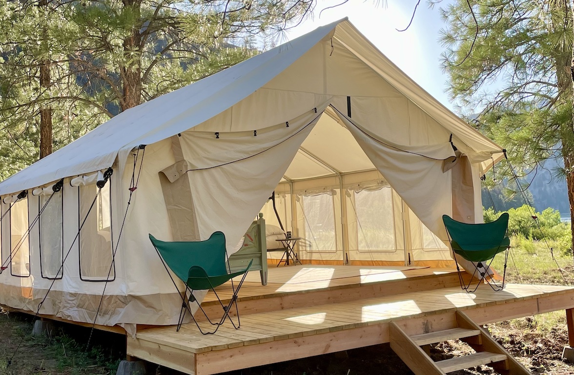 Their camp straddles a beautiful stretch of the river, with cozy and bright glamping tents with views upstream. For the adventurous, a short hike off the back of the property gives you a panoramic view of the camp and river.