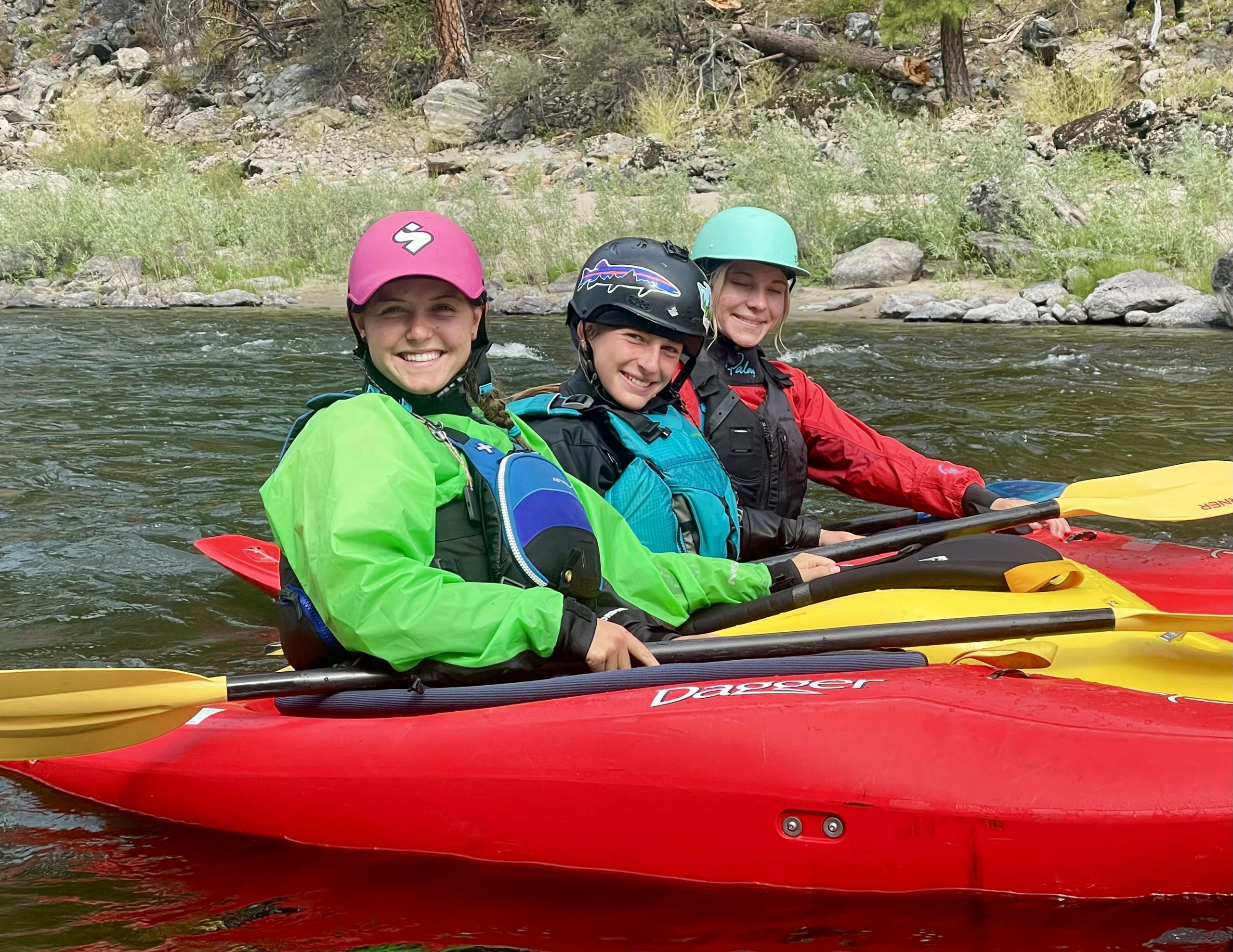 Discover the joy of running rivers in a kayak with the ladies! Enjoy 4 days at our pristine, all inclusive, base camp on the wild and scenic Salmon River in Idaho. Expert women guides provide personalized instruction, teaching you the fundamentals of whitewater paddling.